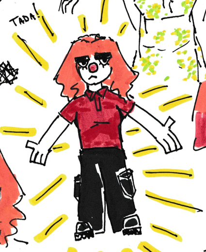 Half-flattened curls, big round clown nose, three bottom eyelashes, thick brows... IRLs were being very annoying about all the similarities between her and I and I've had to defend myself from piss-drinking allegations (wink wink), but it was worth it. I love her design, and I love drawing expressions and poses for her.